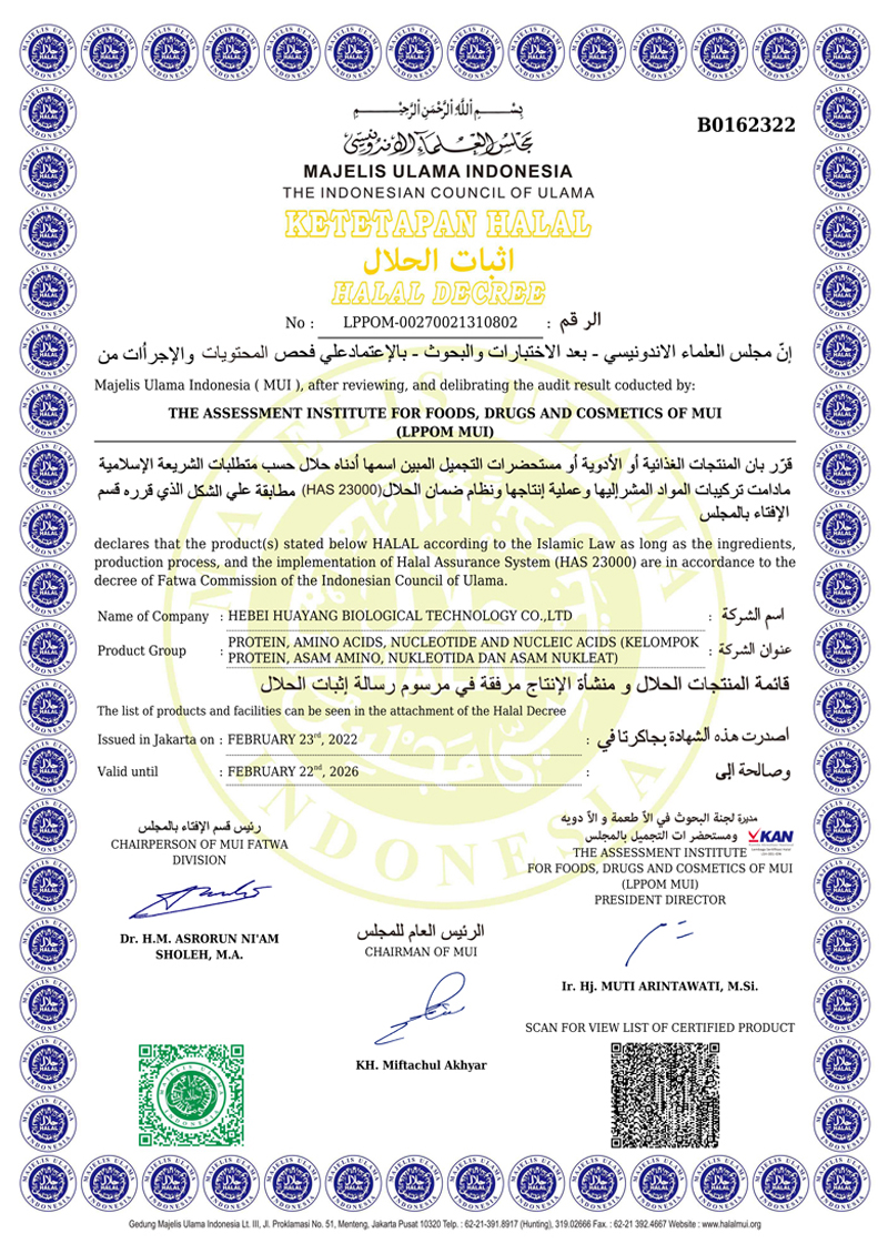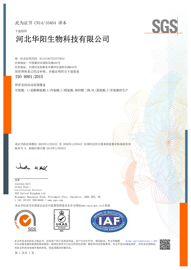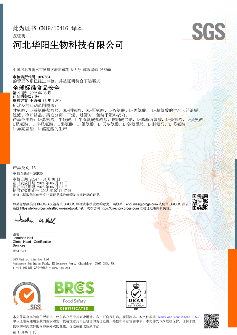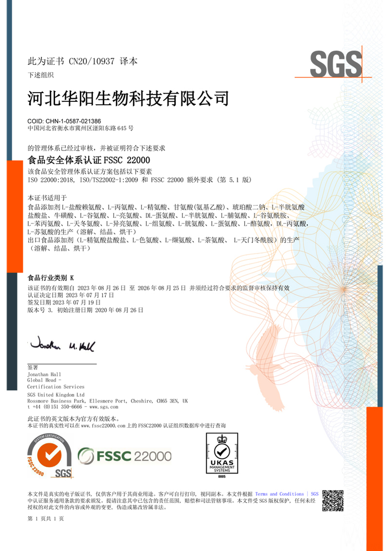 河北華陽(yáng)集團(tuán)坐落于河北省衡水市冀州區(qū)省級(jí)工業(yè)園區(qū)(始建于1987年,前身為冀州市華陽(yáng)化工有限責(zé)任公司)。集團(tuán)下屬四個(gè)公司:河北華陽(yáng)生物科技有限公司、河北華悅氨基酸科技有限公司、滄州華晨生物科技有限公司、衡水市陽(yáng)力商貿(mào)有限公司。主要生產(chǎn)甘氨酸、L-丙氨酸、L-蘇氨酸、DL-蛋氨酸、L-賴氨酸鹽酸鹽、L-半胱氨酸鹽酸鹽、干貝素等氨基酸系列食品級(jí)產(chǎn)品,廣泛應(yīng)用于食品、飲料、飼料等行業(yè)。......